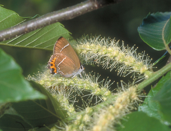 日本にはFixsenia属が4種生息している.カラスシジミ,ミヤマカラスシジミ,ベニモンカラスシジミとリンゴシジミである.富士に住んでいたときはミヤマカラスシジミが,倉敷にいたときはベニモンカラスシジミが多かった.宮崎にはカラスシジミとミヤマカラスシジミが生息しているが,ミヤマカラスシジミは食樹であるクロウメモドキが宮崎では高山地帯にしか生えていないので,椎葉村などに僅かに生息しているだけである.それに対してカラスシジミは宮崎に多いハルニレを食樹としているので,市街地近くでも姿を見るときがある.カラスシジミは他の地域ではそれほど数が多い種類ではないので,南限の蝶であると同時に,宮崎を代表する蝶でもある.5月の終わり頃,栗の花を探すと,カミキリなどの甲虫と一緒に吸蜜している姿を見かける.宮崎県レッドリスト準絶滅危惧(NT-g)