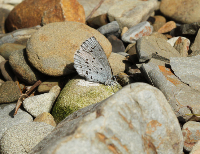 九州のスギタニルリシジミは大きくて羽裏が白い個体が多い.九州産は亜種とされているが,本州産のように,羽裏が灰色で小さい個体もいる.小さい個体と大きい個体が飛んでいると,大きい方はルリシジミのようだ.宮崎の低山地にはトチノキは見当たらず,食樹としてキハダやミズキが確認されている.宮崎県レッドリスト準絶滅危惧(NT-g)