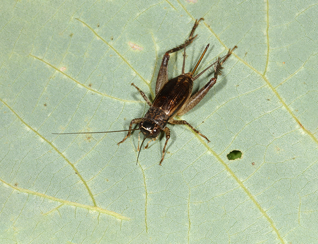 腹眼間にある一文字の白斑が特徴的なコオロギ.