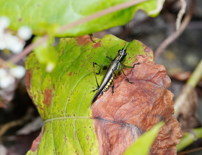 特徴的な色彩で他のササキリ類とはすぐに区別できる.若齢幼虫も,赤と黒色からなるので見間違えることはない.南方系の種で,県内各地で見られる.