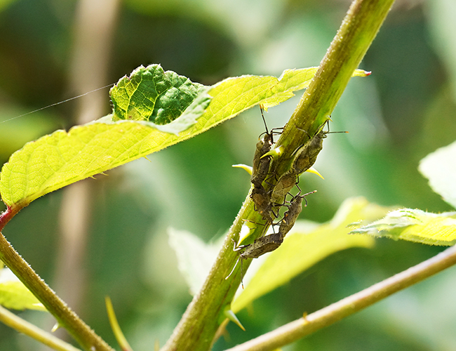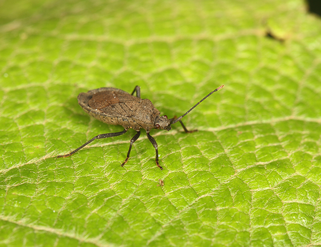 触覚の先端が黄色いヘリカメムシ.似た種にオオツマキヘリカメムシがおり,宮崎市内ではどちらも見られる.同定には生殖節を検鏡する必要があるが,まだ自然共生サイト内ではオオツマキヘリカメムシを確認していない.