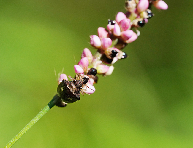自然共生サイト内では3種のシラホシカメムシ属を見るが,紫色ががった光沢があり,横幅が広くて白紋が大きければムラサキシラホシカメムシである.