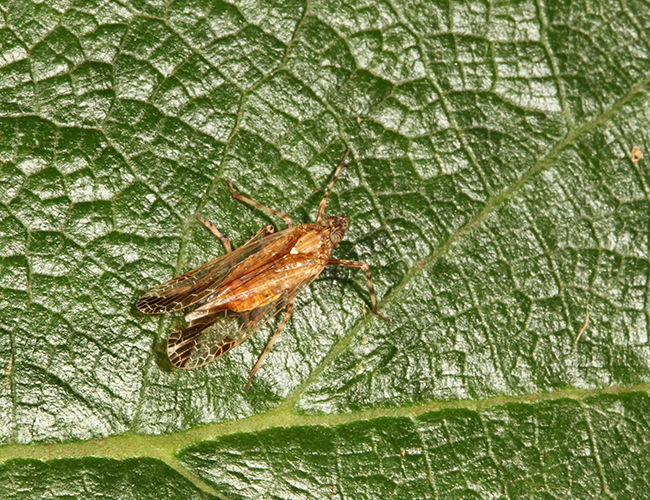 体長が11〜15mmの大きいウンカ.翅端の暗褐色帯が目立つ.