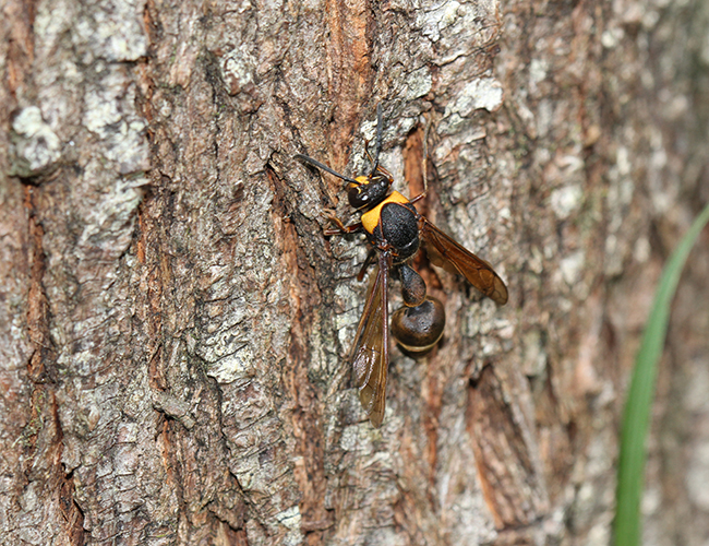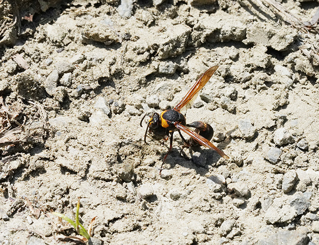頭盾と肩の黄褐色が目立つ大型のドロバチ.個体数は多い.