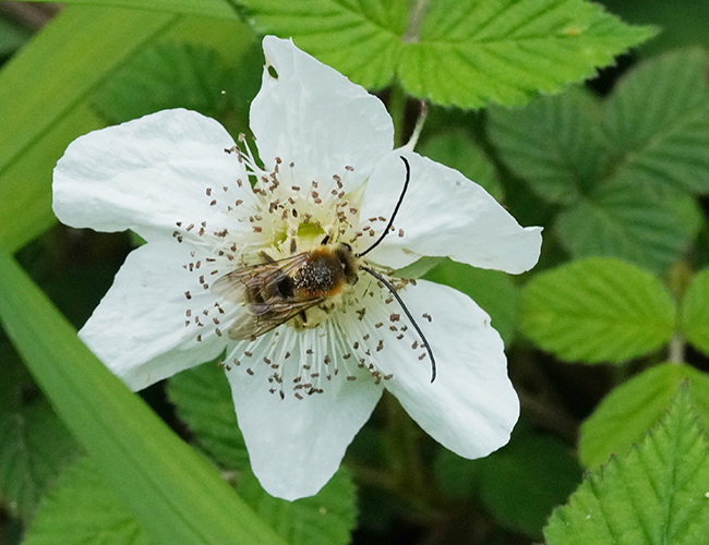 ♂の触覚が非常に長いハナバチ.春,花の周りをよく飛んでいる.