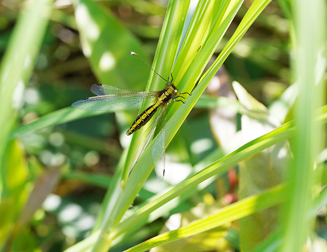 ツノトンボ♂は尾端の付属器が目につく.幼虫はアリ地獄のような凶暴な姿をしている.