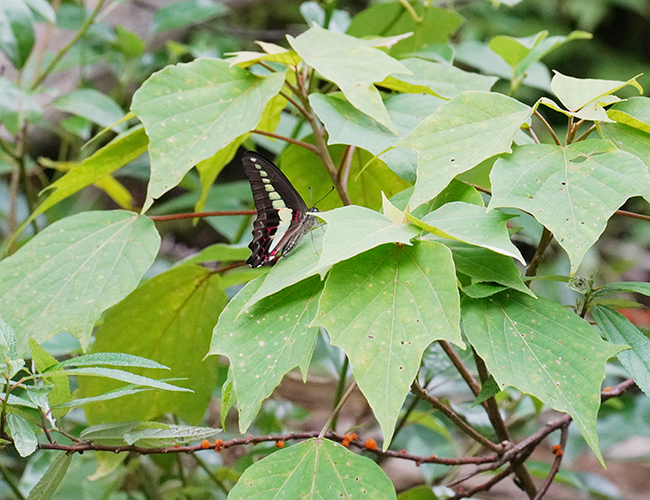 アオスジアゲハはタブやクスなどクスノキ科樹木を寄主としている.宮崎の照葉樹林にはクスノキ科樹木が多いので,アオスジアゲハの個体数も多い.自然共生サイトでは見ていないが,林道一面に多数のアオスジアゲハが吸水している姿を見かけることもある.