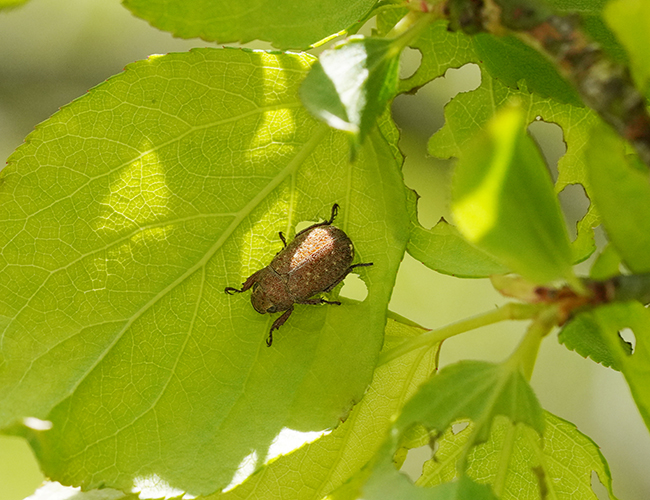 コイチャコガネは各種広葉樹で見られる.少し触ろうとするだけで,ポトリと下に落ちる.