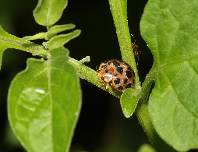 肉食ではなく草食のテントウムシ.ナスやジャガイモなどのナス科植物に寄生するので,農家からは嫌われている.