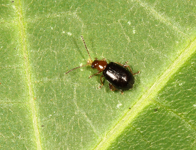 頭,胸と肢が赤褐色の小さなハムシ.サンショウ類に付つが,個体数は少ない.