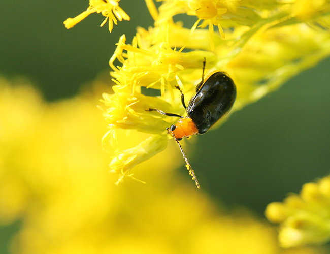 黄色と黒色で目立つハムシで個体数は多い.各種の花に来るが,農家からはウリ類の害虫として嫌われている.