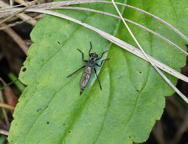 肢全体が黒いムシヒキアブ.県内での個体数は少ないが,自然共生サイトでは良く見かける.