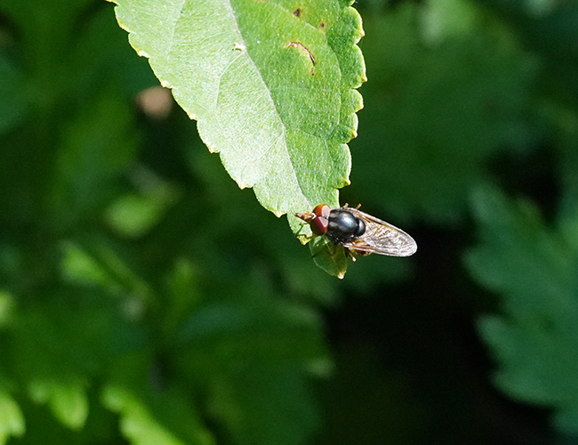 口吻が伸び,天狗のような顔をしたハナアブ.個体数は少ない.