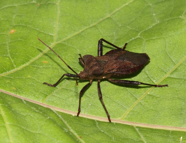 体長18.8〜25.2mm ミナミオオヘリカメムシが新種記載されたので、それまでオオヘリカメムシとラベルのある県内の標本を見直してみた。県総合博物館にある標本9個体を確認したところ、8個体はミナミオオヘリカメムシであり、1個体のみオオヘリカメムシであった。ミナミオオヘリカメムシの産地には県北大崩山系のものも含まれていたので、県内ではオオヘリカメムシよりミナミオオヘリカメムシが優勢であることが確認できた。唯一確認できたオオヘリカメムシは霧島山系で採集されたものであった。祖母山系の麓のスズタケ群落からオオヘリカメムシの終齢幼虫が採集されている。(高千穂町、霧島山系)