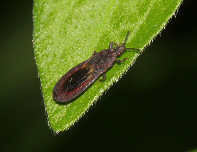体長5.7〜7.2mm 長卵形の濃い茶色で、腹部腹板にツヤがある。県内では比較的多いナガヒラタカメムシで、春に草の上で日光浴している姿を良く見かける。(延岡市、日向市、小林市、高原町、綾町、国富町、宮崎市、日南市)