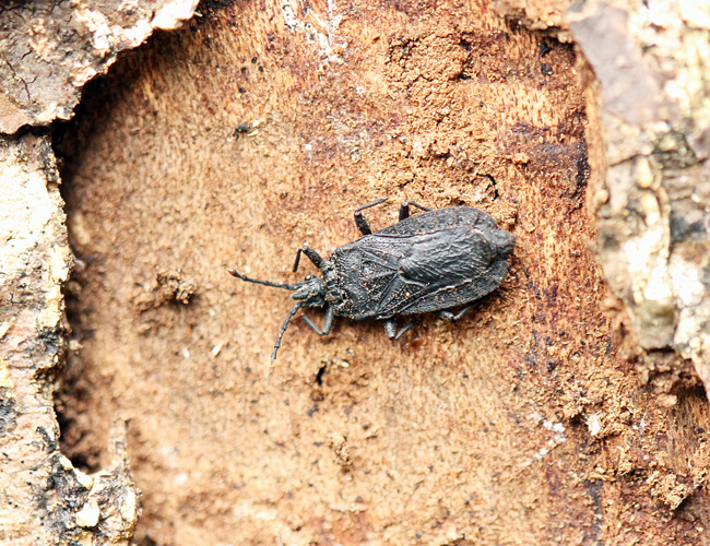 体長9.5〜12mm 大きいヒラタカメムシで、枯木や倒木の樹皮下で良く見つかる。前胸背の後縁が前方へ湾入するのが特徴。(高千穂町、日之影町、椎葉村、延岡市、小林市、高原町、綾町、宮崎市、日南市)