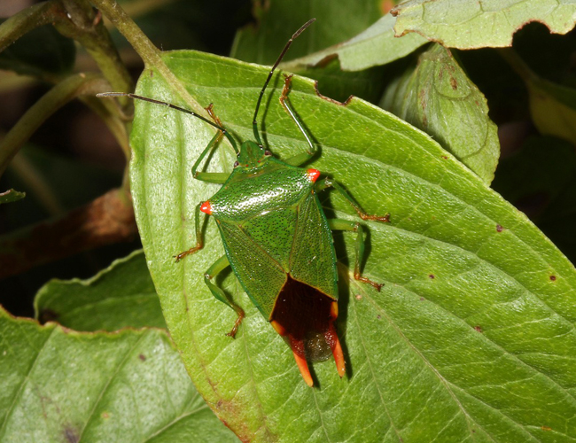 体長18mm内外 鮮やかな緑色に前胸背側角のオレンジ色が目立つ.県内の山間部で良く見られ,灯火にも集まる.♂の生殖節にあるハサミ状突起は平行に突き出す.(五ヶ瀬町,高千穂町,延岡市,椎葉村,美郷町,西米良村,都農町,えびの市,小林市,高原町,都城市,綾町,宮崎市,日南市)
