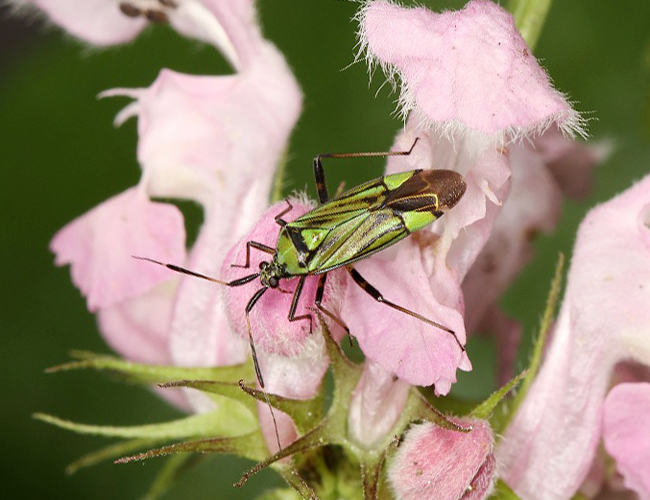 体長7.5mm内外 緑色の体に黒い縦筋が入った綺麗なカスミカメ。北方系の種で、県北の里山に生息している。5月初め頃にオドリコソウで良く見かける。(高千穂町、日之影町、延岡市、小林市)