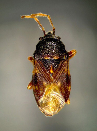 体長3mm内外 ずんぐりとした体形で、体は強く点刻される。前胸背の中央は盛り上がる。小楯板の先端が黄白色で、革質部にも黄白色紋がある。南方系の種で屋久島と奄美大島に分布しており,県内の記録はこの個体だけ。(椎葉村)