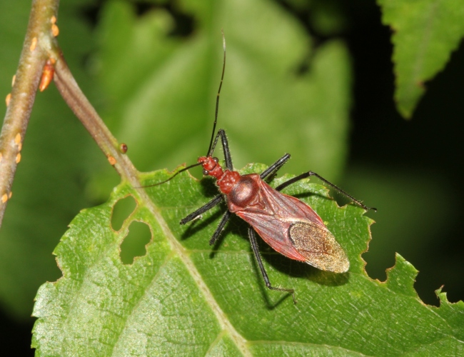 体長14〜17mm 全体に朱色で、脚と膜質部が黒い。葉上に多く、鱗翅類幼虫や甲虫を好んで捕食する。赤色が目立つので、気づきやすい。飛翔力も強く、昼間でも林間を飛んでいることがある。県内には幅広く分布している。(高千穂町、日之影町、椎葉村、延岡市、日向市、都農町、西都市、えびの市、小林市、高原町、都城市、綾町、国富町、宮崎市、日南市、串間市)