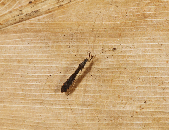 体長4.1〜6.1mm ヒメマダラカモドキサシガメに似るが,体が大きく後脚腿節の先端に近い黒色環状紋が先端の白色部より長い.(日南市)