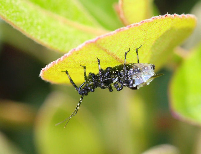 体長12〜16mm 体が松脂状の粘着物で覆われており、これで獲物を動かないようにしていると言われている。マツの樹に多いが、マツから離れた樹木でも見られる。(椎葉村、延岡市、日向市、都農町、西都市、小林市、都城市、宮崎市)