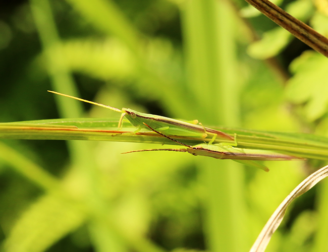 ショウリョウバッタに似るが脚が短い.体色はチガヤに似ており,チガヤに止まっていると見つけにくい.