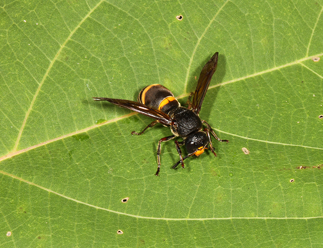 ずんぐりとして胸部が黒く額に黄斑のあるドロバチ.県内での確認例は少ない.