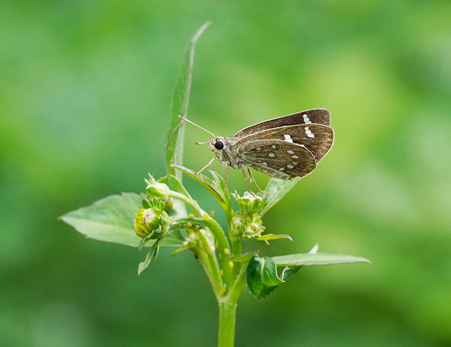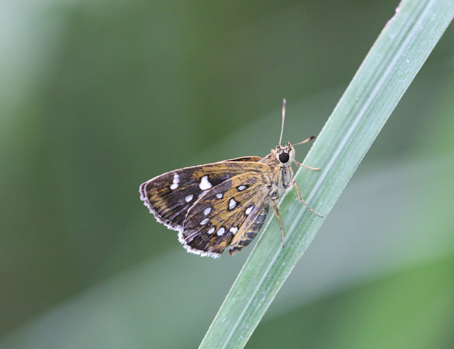 翅裏の白点が綺麗なセセリチョウ.ススキやチガヤを食草とするので,ススキが多く残る自然共生サイト内ではよく見かける.