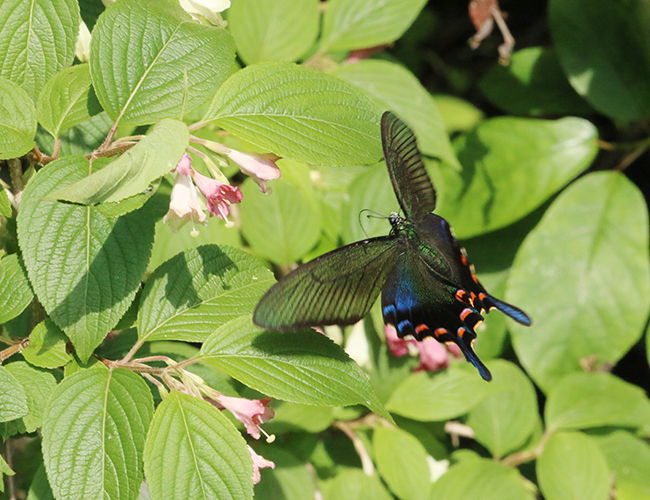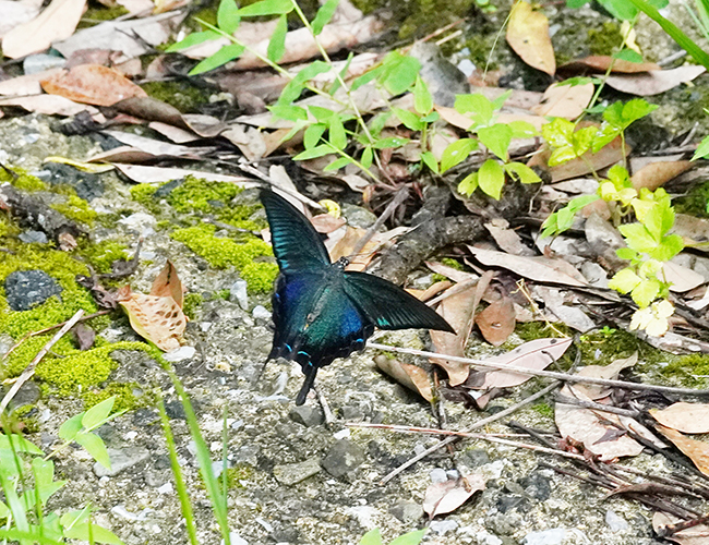 青緑色に輝く鱗粉が綺麗なアゲハチョウ.栽培種のミカンではなくカラスザンショウなど野生のミカン科植物を好む.カラスザンショウには刺があるので,幼木のときに刈られてしまうことが多い.自然共生サイト内ではカラスザンショウを残す取り組みを行っているので,カラスアゲハをはじめとする大型アゲハ類が多い.