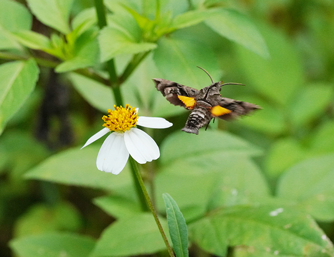 ホシヒメホウジャクの後翅の黒帯は後方で狭くなる.幼虫はヘクソカズラを食べる.