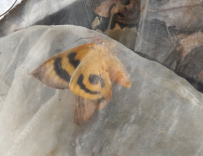 成虫で越冬する大きな蛾.MRTの森では冬に成虫を確認した.