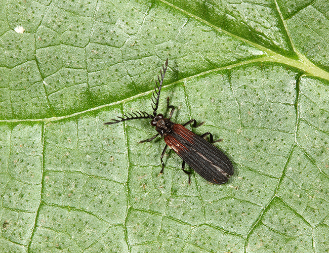 ミダレクロベニボタルと見分けがつきにくいが,♂の複眼間の幅が狭い.