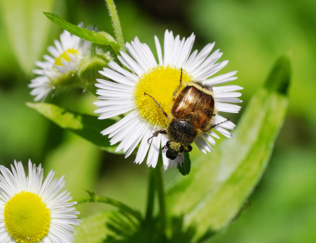 茶色で小さなハナムグリ.翅に横縞の虎模様が出る個体が多いが,この個体は縞模様が薄い.