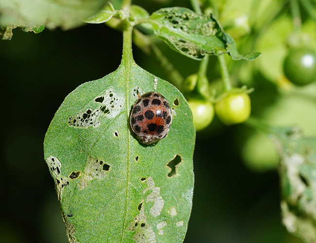 肉食ではなく草食のテントウムシ.ナスやジャガイモなどのナス科植物に寄生するので,農家からは嫌われている.