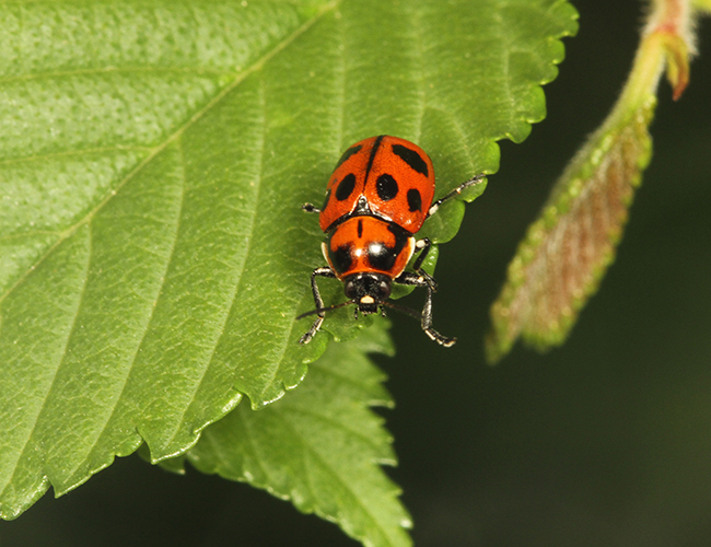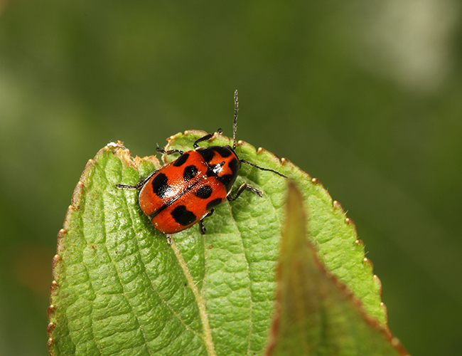 赤色に黒い紋のある綺麗なツツハムシ.個体数は少なくなく,バラ科植物に多い.